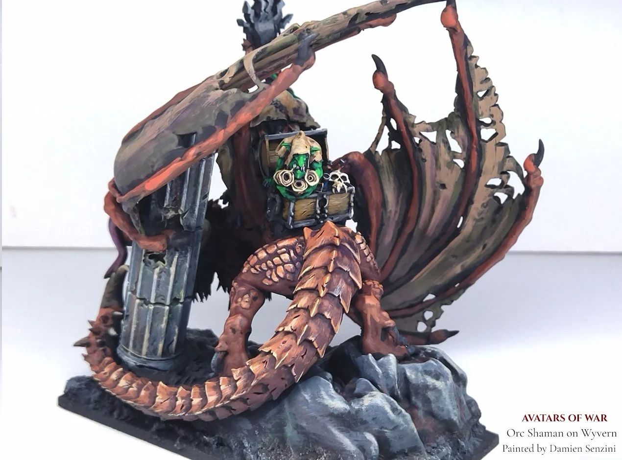 A veteran Orc Shaman riding his now-ancient Wyvern, both hardened by decades of war and ancestral magic.