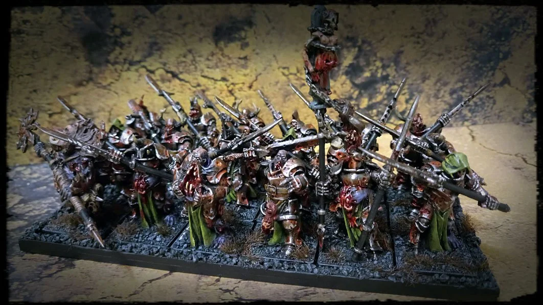 Warriors of Pestilence are corrupted fighters devoted to decay and ruin, marching to war beneath rusted armor and diseased banners.